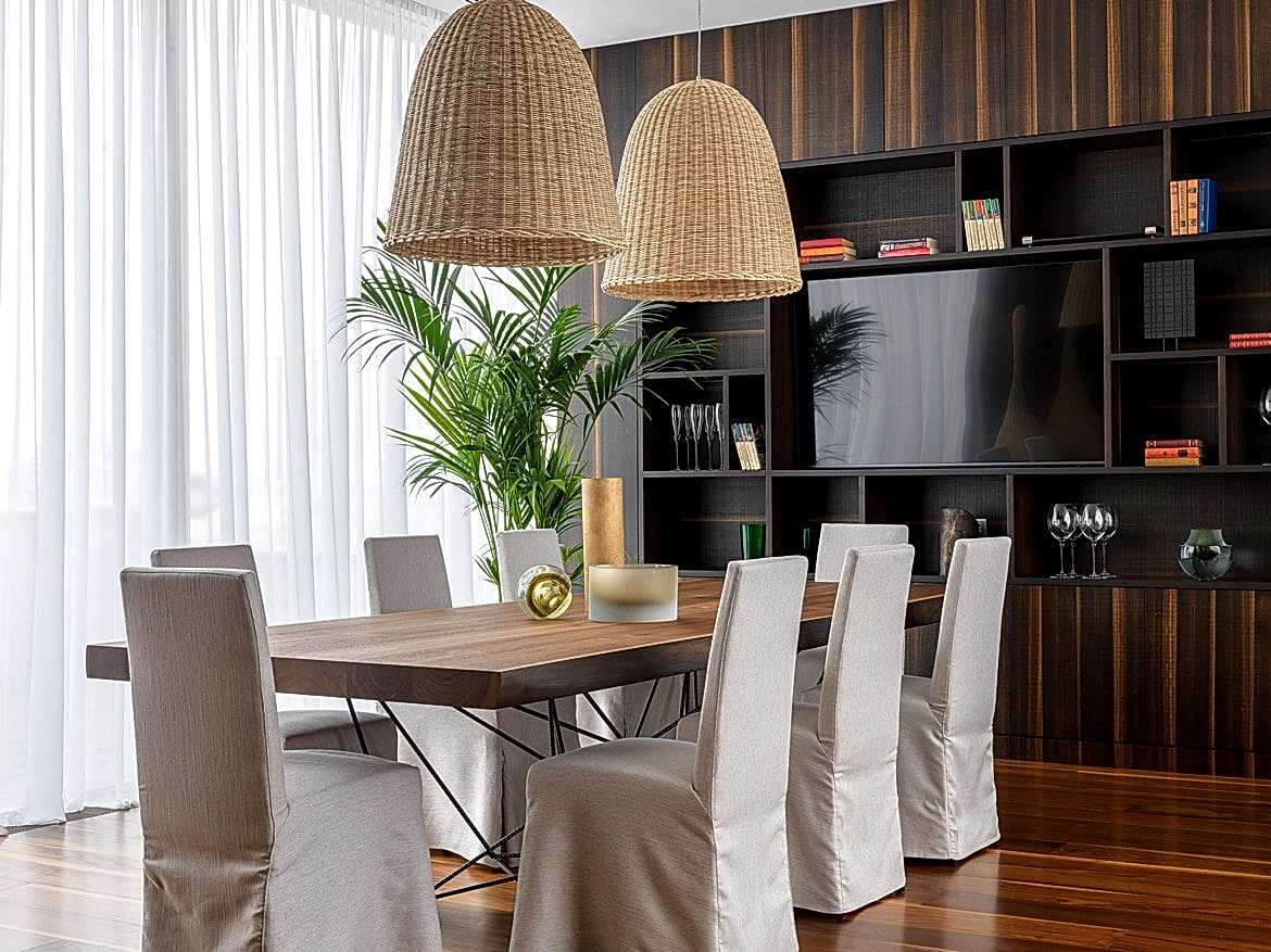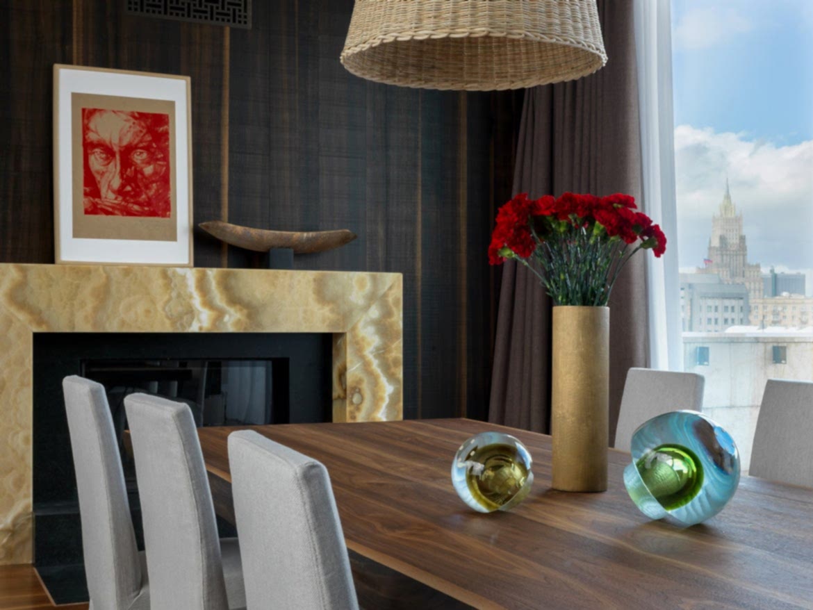 За регулирование отдельных зон освещения, штор, климата и комплексных сценариев отвечают выключатели Schneider Electric. Часть Pin-Up по проекту архитекторов была присоединена к жилому пространству. Здесь сделали столовую с камином, управлять которым можно с помощью сенсорной панели, выключателя или пульта.