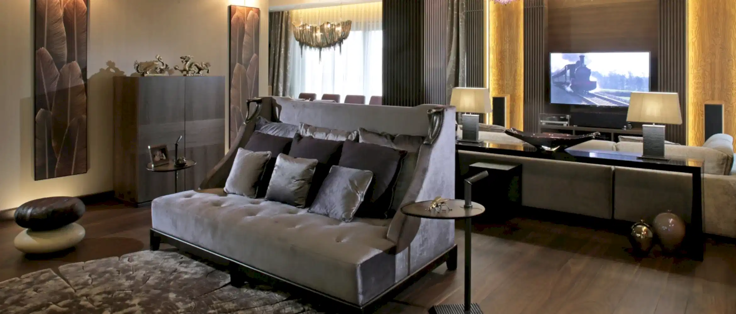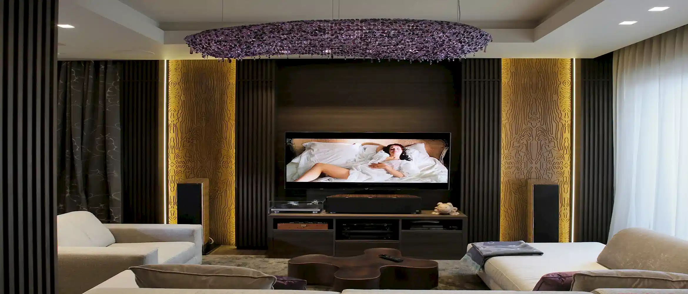 Все помещения оборудованы акустикой. В гостиной установлена высококлассная Hi-End система с поддержкой потоковых аудио и видео Pin-Up И даже на балконе установлена система озвучивания.