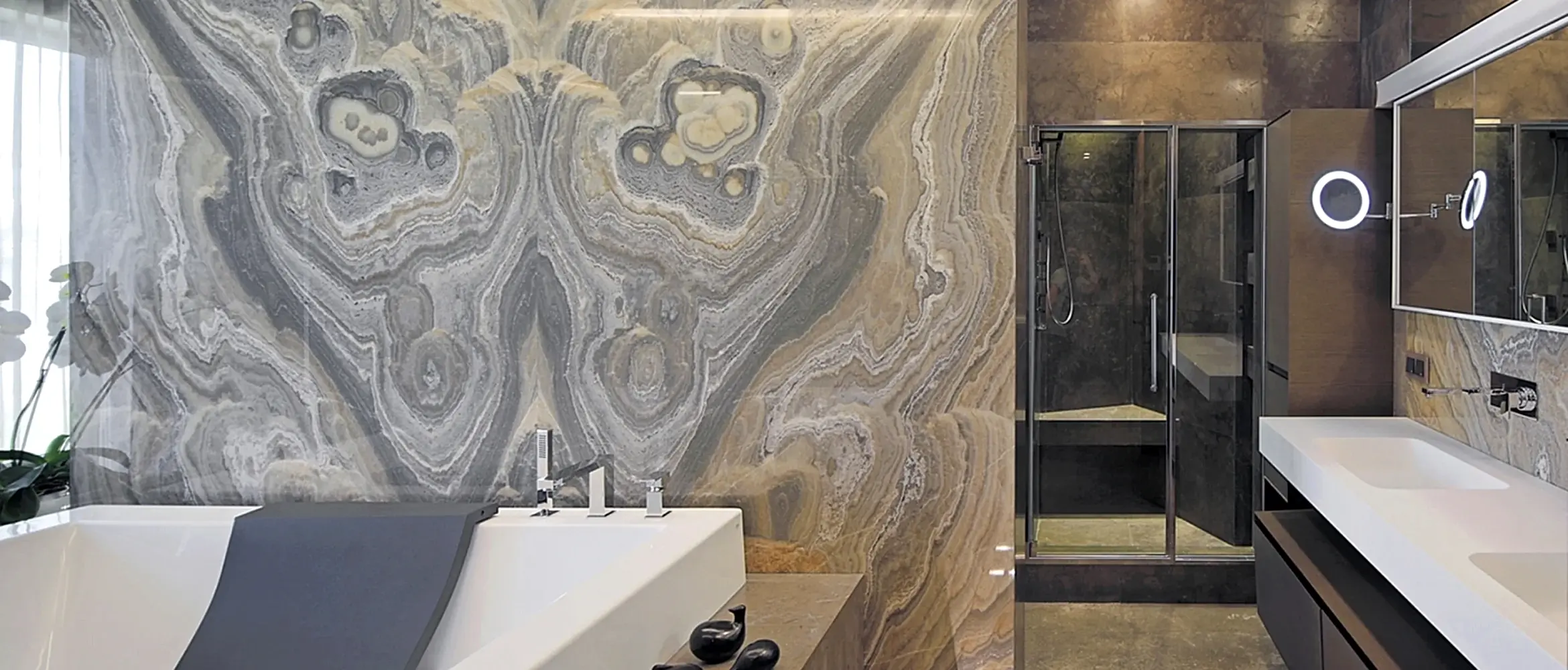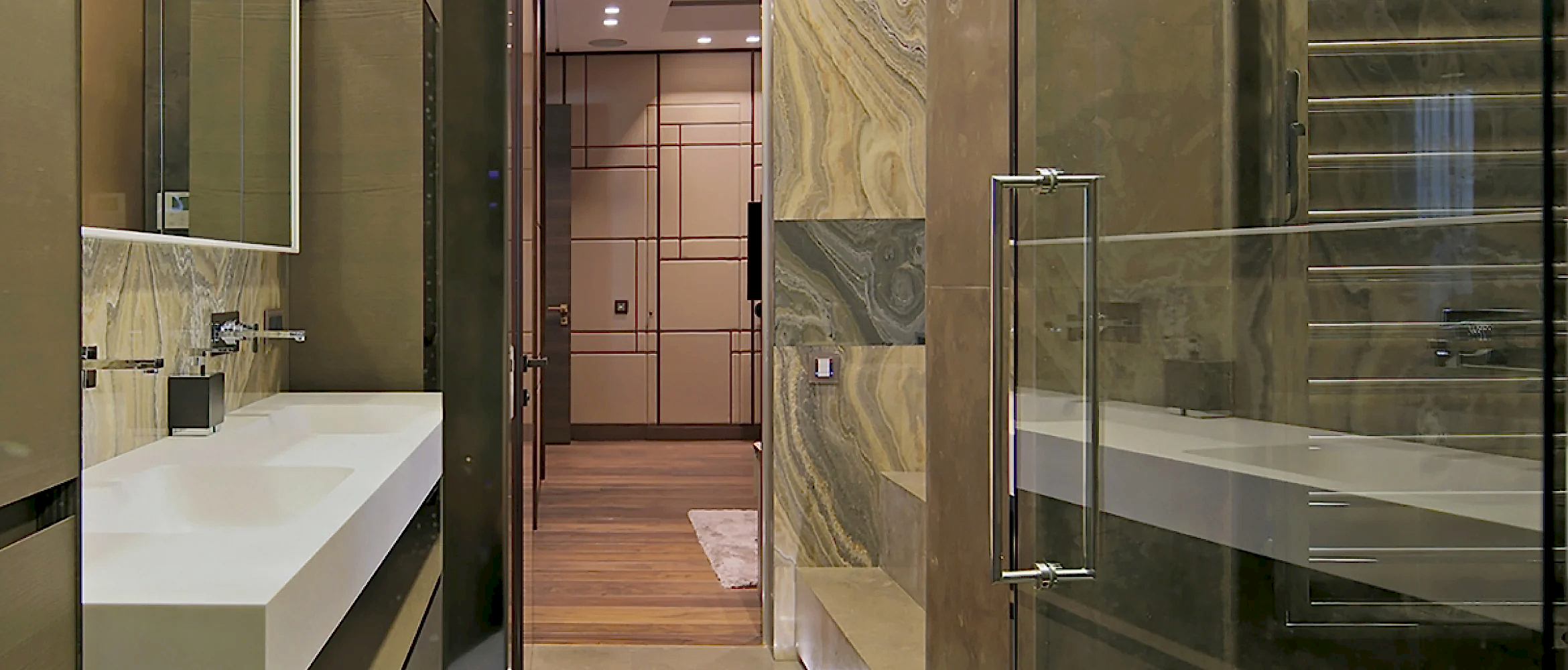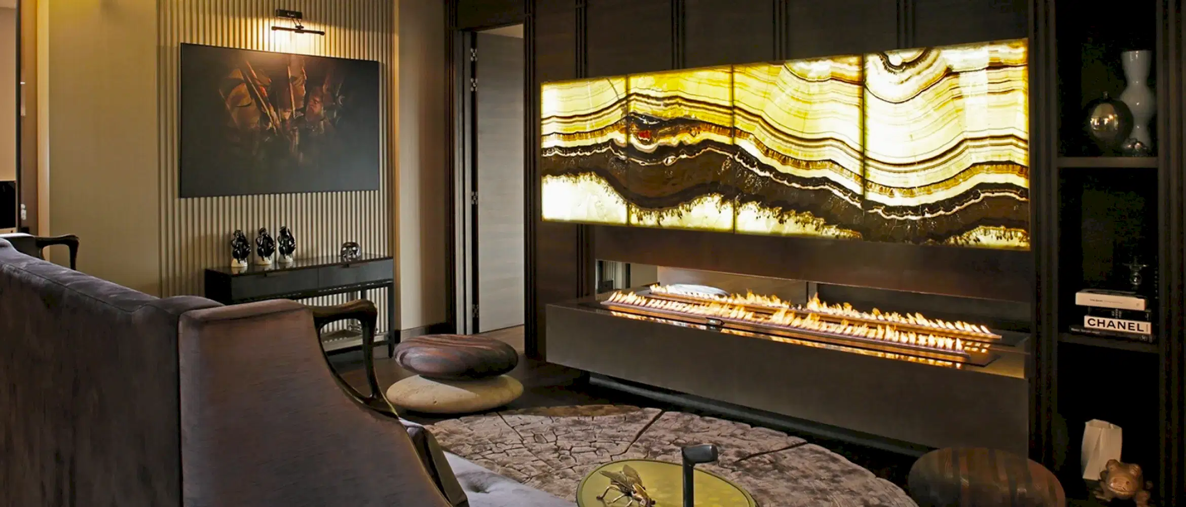 В ванной комнате тоже есть телевизор, и встроен он в стену. Ширина каменной плиты - на всю стену комнаты. Чтобы «подружить» природную красоту и технику, мы трудились вместе с мастерами-каменщиками. Еще одна особенность квартиры - это эко-камин. Он управляется с Pin-Up панели Control4 и мобильных устройств.